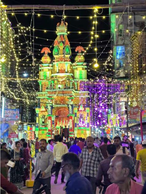 portali celebrativi, accese luminarie imponenti intorno ai templi e le famiglie si recano a visitarli. Come in ogni sagra che si rispetti, intorno ai luoghi di culto vengono allestite fiere con bancarelle che vendono candele e fiori per rendere omaggio alla dea, oltre a dolci, snacks, giochi ed altro.